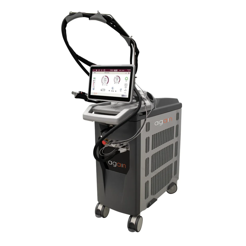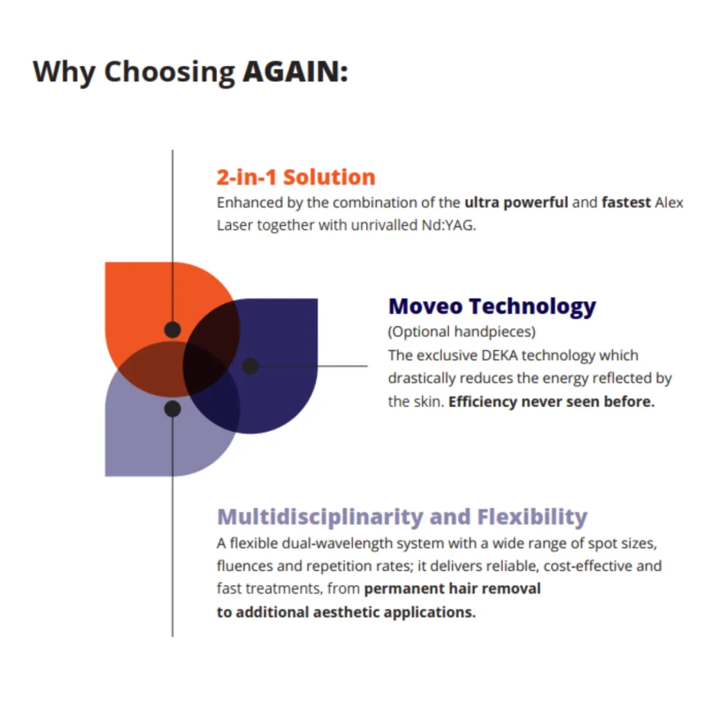 The DEKA Again system combines dual-wavelength laser technology (Alexandrite and Nd) to offer a wide range of treatments, including hair removal, pigmented and vascular lesions, and skin rejuvenation. With a focus on speed and comfort, the system’s Moveo Technology allows for effective treatment while maintaining patient comfort, making it highly versatile for various skin conditions.
