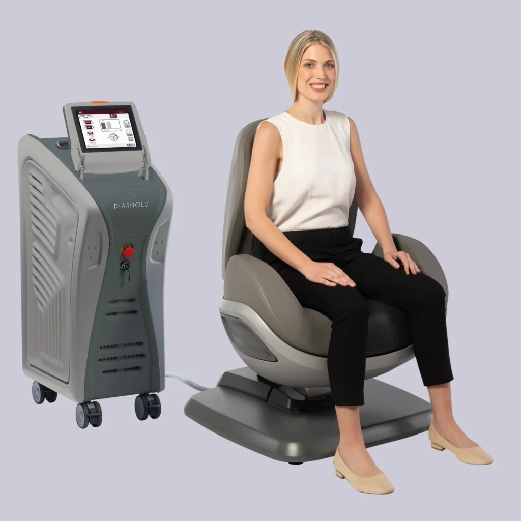 Dr. Arnold is the ultimate ally for intimate health, offering a non-invasive effective, and painless therapeutic treatment using TOP FMS Technology. Designed with patient comfort in mind, the treatment takes place on a lounge chair that features adjustable height and back support, ensuring a relaxing experience.