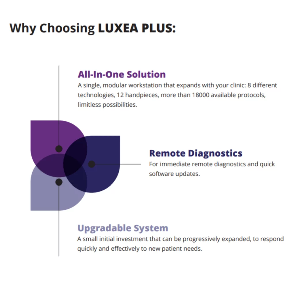Luxea Plus is not only powerful but also smart. It features remote diagnostics for instant troubleshooting and software updates, ensuring uninterrupted performance. Whether treating pigmentation, vascular conditions, skin tightening, or hair removal, this device delivers exceptional results with minimal downtime.