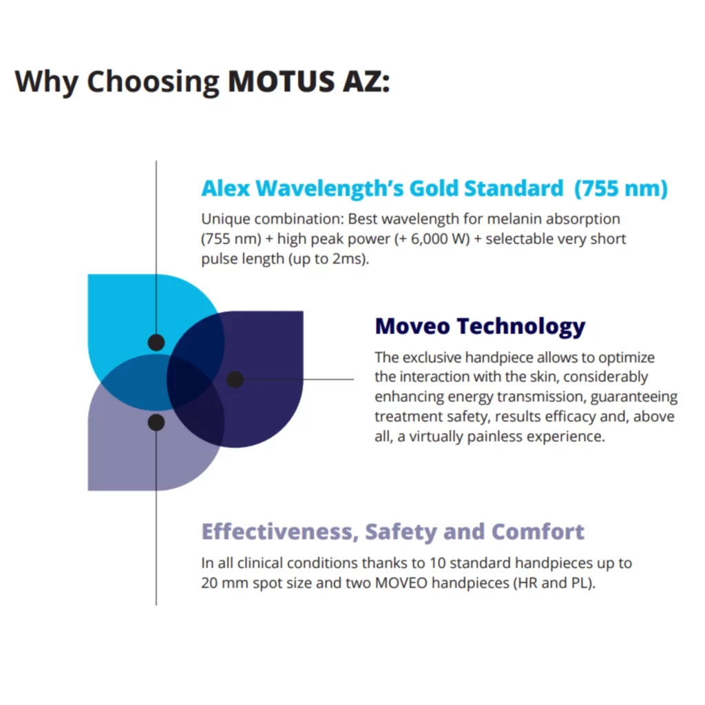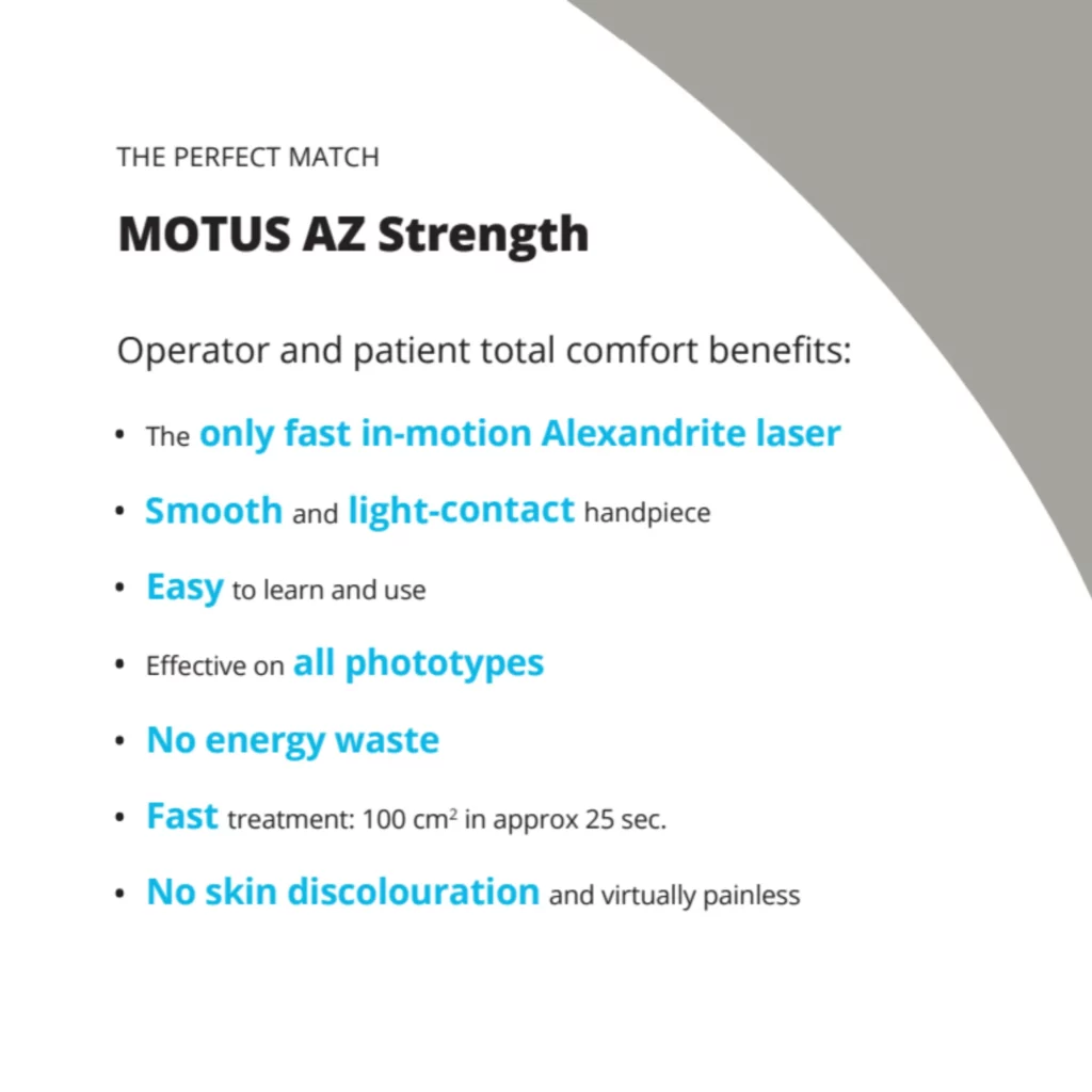 Designed for ease of use, Motus AZ is compact, cost-efficient and requires minimal maintenance. Its versatility, combined with Moveo Technology, makes it the ultimate choice for clinics & beauty centres aiming to provide high-quality, safe and effective laser treatments across a broad patient demographic.The Alexandrite 755 nm wavelength is the gold standard for achieving superior precision in treating fine and light hair.